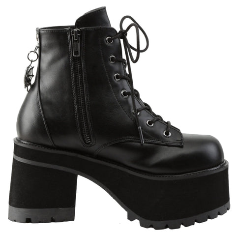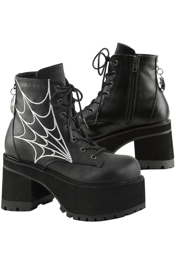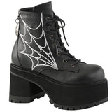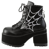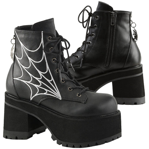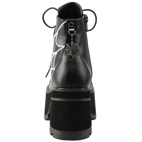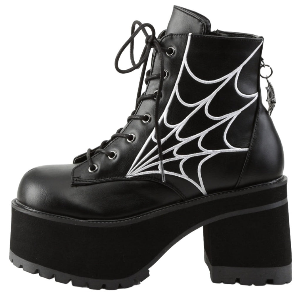 Black leather effect ankle boot with four inch block heel and two and a half inch platform sole. White cobweb design on side of boot, and Spiderweb Charm at back. Front lacing.