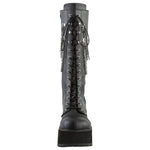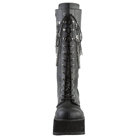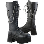 3 3/4" (95mm) Heel, 2 1/4" (57mm) Platform Lace-Up Front Knee High Boot Featurning Silver Chains and Studded Back Strap with O-Rings, Inside Zip Closure.