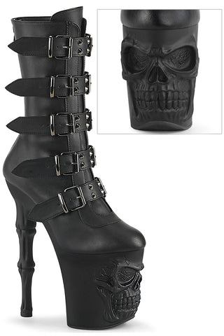 8" (200mm) Finger Bone Heel, 4" (100mm) Skull Sculpted Platform Mid Calf Boot Featuring Multi Metal Spike Adorned Buckle Straps, Inside Metal Zip Closure.