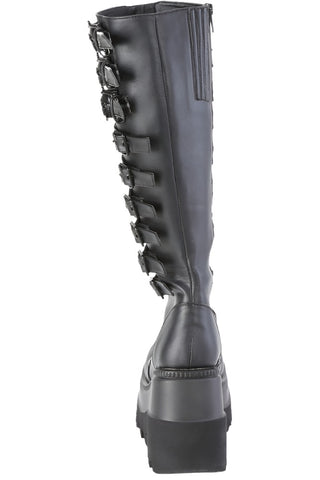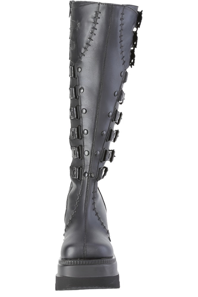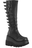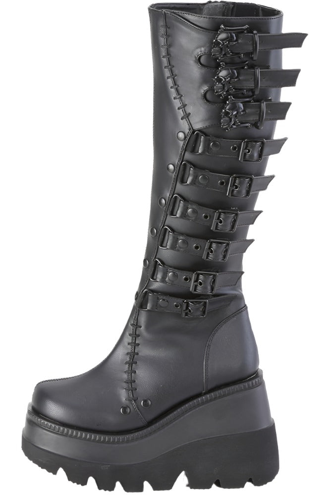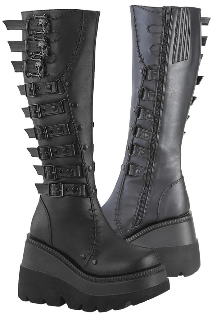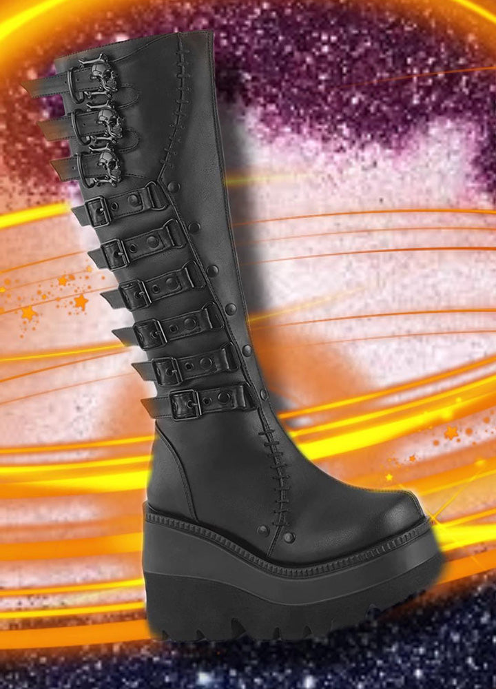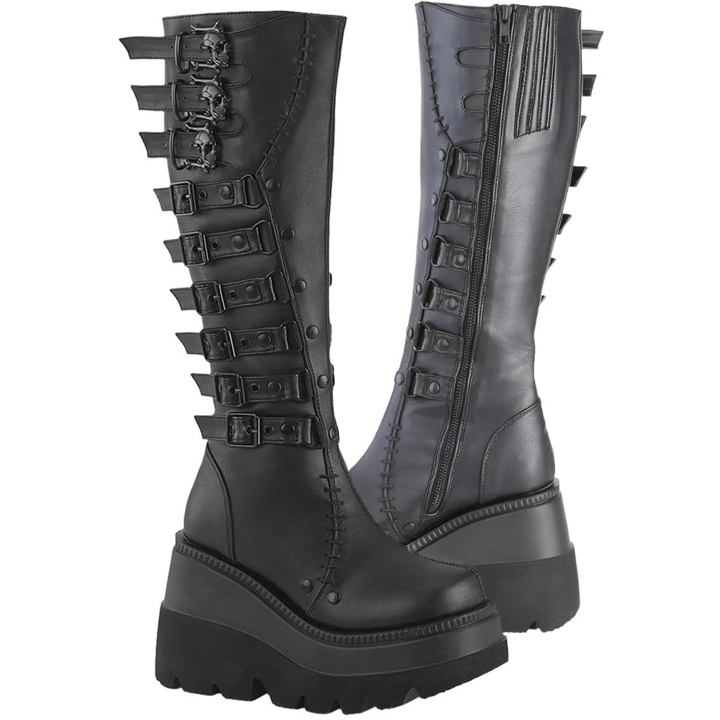 Keywords: DemoniaCult Shaker-232 Boots, Black Boots, Knee High Boots, Platform Boots, Wedge Boots, Vegan Leather Boots, Buckle Boots, Skull Boots, Goth Boots, Punk Boots, Alternative Fashion Boots, Comfortable Boots, Statement Boots