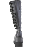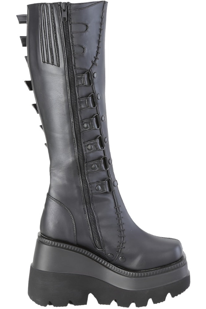 Command attention and conquer your day with the DemoniaCult Shaker-232 Knee High Boots. These statement boots boast a wedge platform sole and a bold, black vegan leather build, accented with unique details that let you showcase your edgy side.