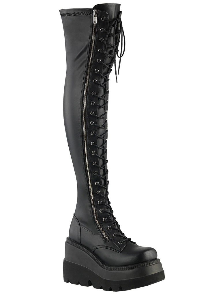 Keywords: DemoniaCult Shaker-374 Boots, Black Boots, Vegan Leather Boots, Thigh-High Boots, Platform Boots, Wedge Boots, Stretch Boots, Lace-Up Boots, Goth Boots, Punk Boots, Alternative Fashion Boots, Comfortable Boots, Festival Boots, Minimalist Boots