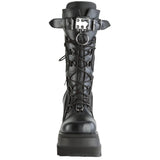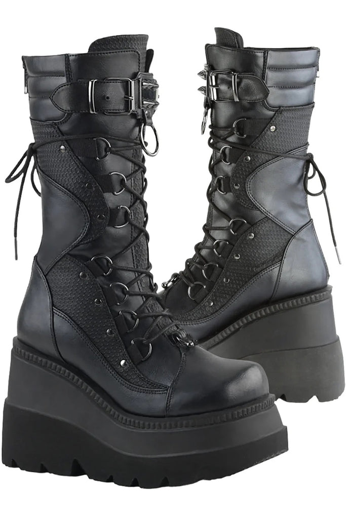 4 1/2" Wedge Platform Lace-Up Mid-Calf Boot with Curvy Contrast Panel Designs on Vamp, Featuring Horseshoe Ring Ornament and Buckle Strap with Spike Studded Metal Plate and A Large O-Ring, Metal Back Zip Closure.