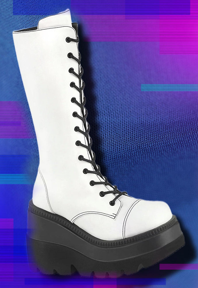 Keywords: DemoniaCult Shaker-72 Boots, White Boots, Patent Leather Boots, Mid-Calf Boots, Platform Boots, Wedge Boots, Lace-Up Boots, Zip-Up Boots, Alternative Fashion Boots, Comfortable Boots, Festival Boots, Streetwear Boots, Modern Boots