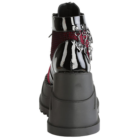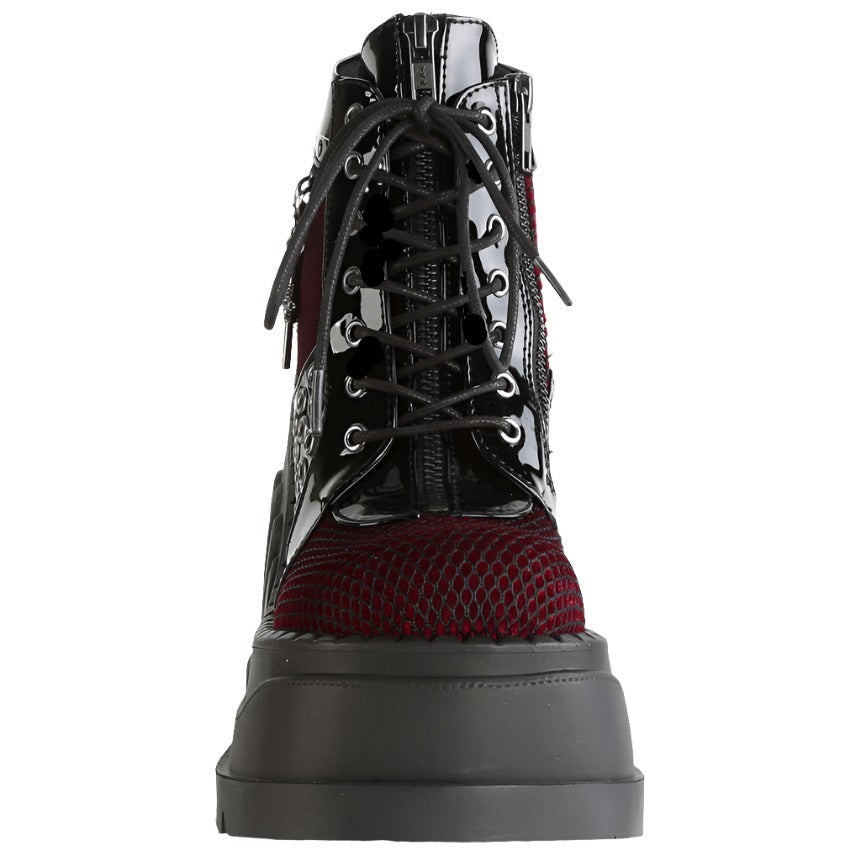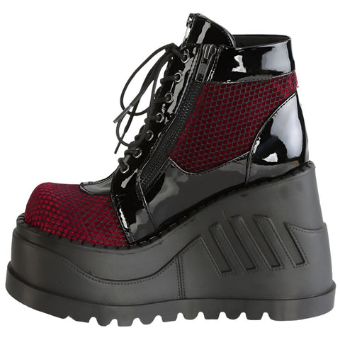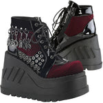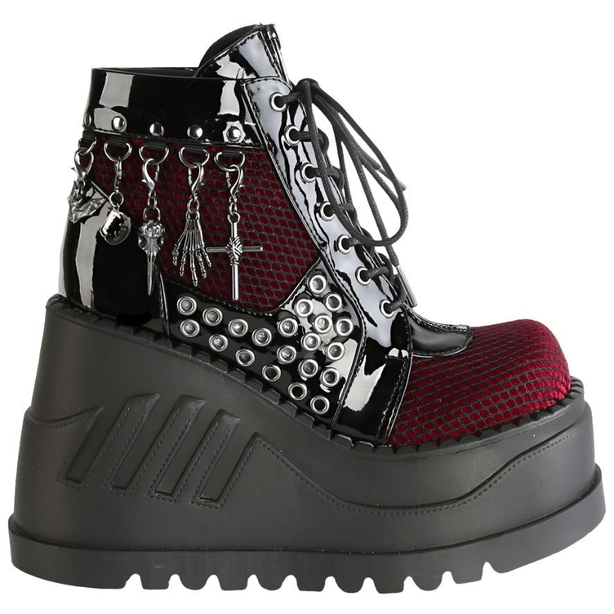 The Burgundy Velvet STOMP-18 isn't just about height; it's brimming with captivating design elements. A fishnet overlay with eyelet studs adorns the vamp, adding a touch of whimsical intrigue. Five dangling metallic charms with unique designs add a touch of playful personality, while a non-functioning zipper detail on the tongue injects a hint of rock-and-roll rebellion. Secure lace-up detailing with eyelets on the outer side panel allows for a customized fit.