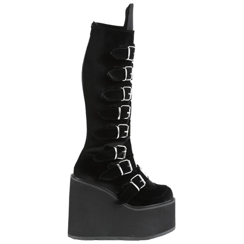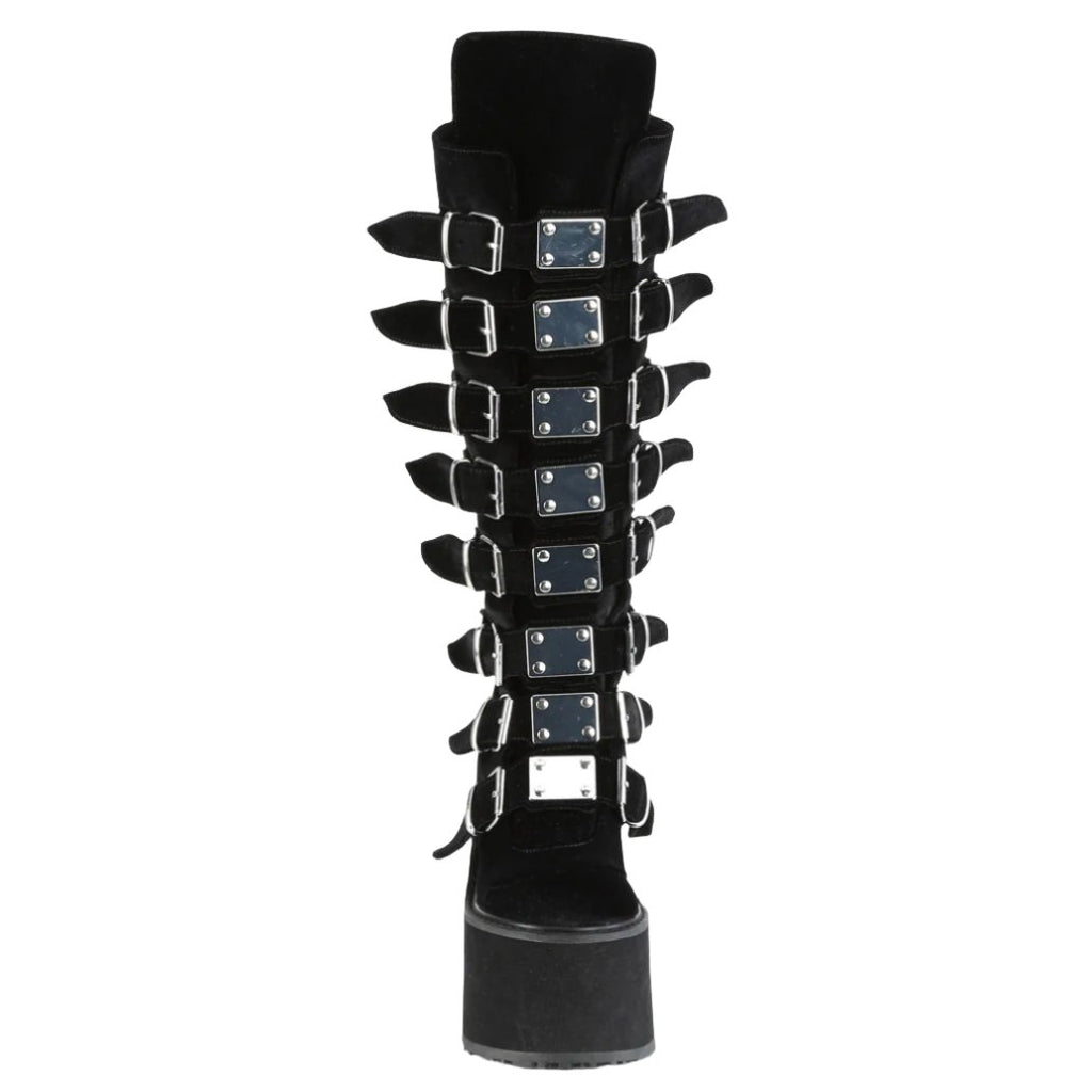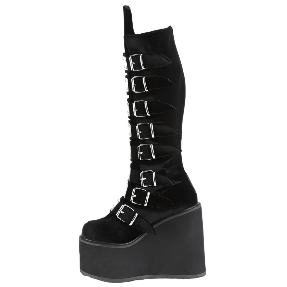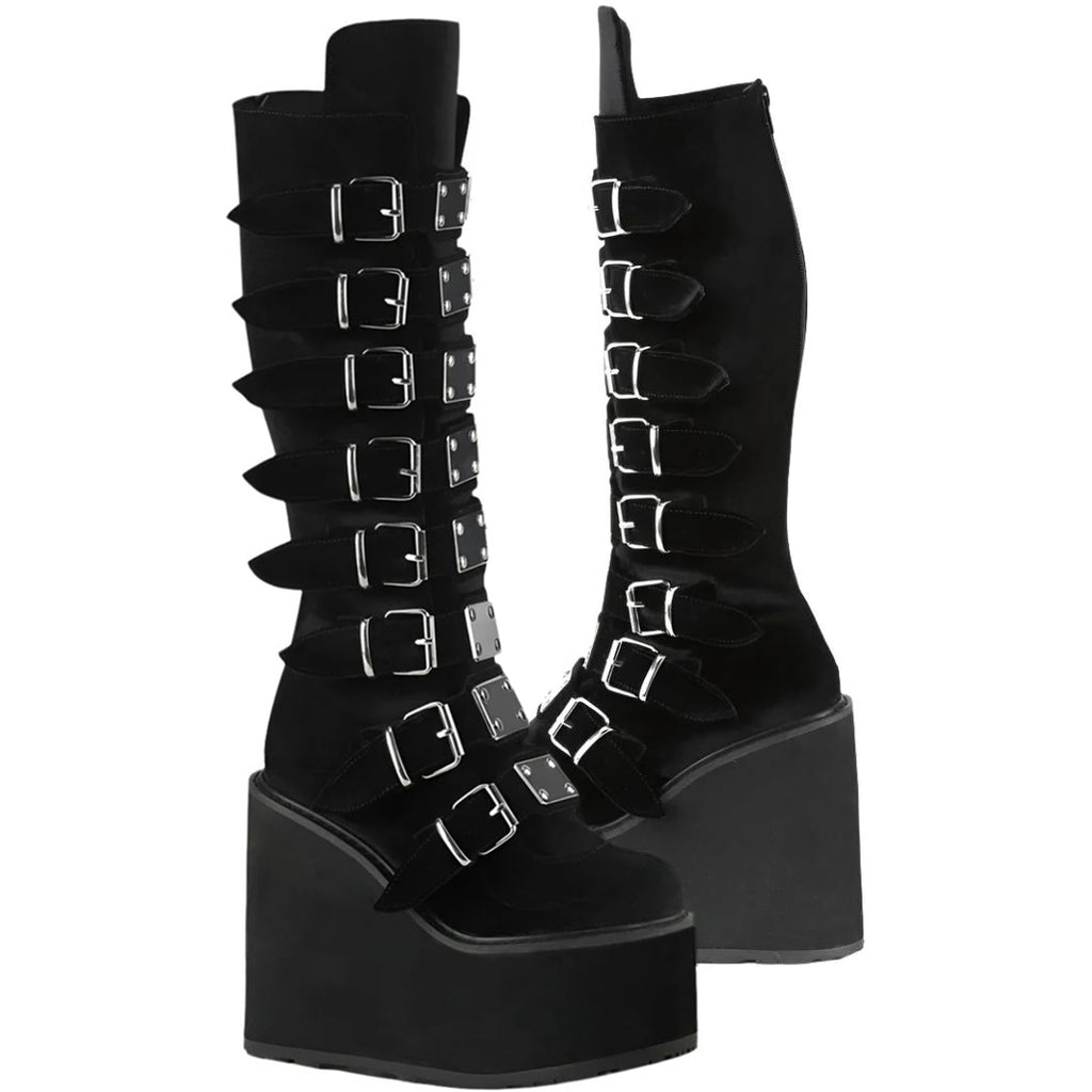 Keywords: DemoniaCult Swing-815 Boots, Black Boots, Velvet Boots, Platform Boots, Knee High Boots, Buckle Boots, Goth Boots, Punk Boots, Festival Boots, Alternative Fashion Boots, Comfortable Boots