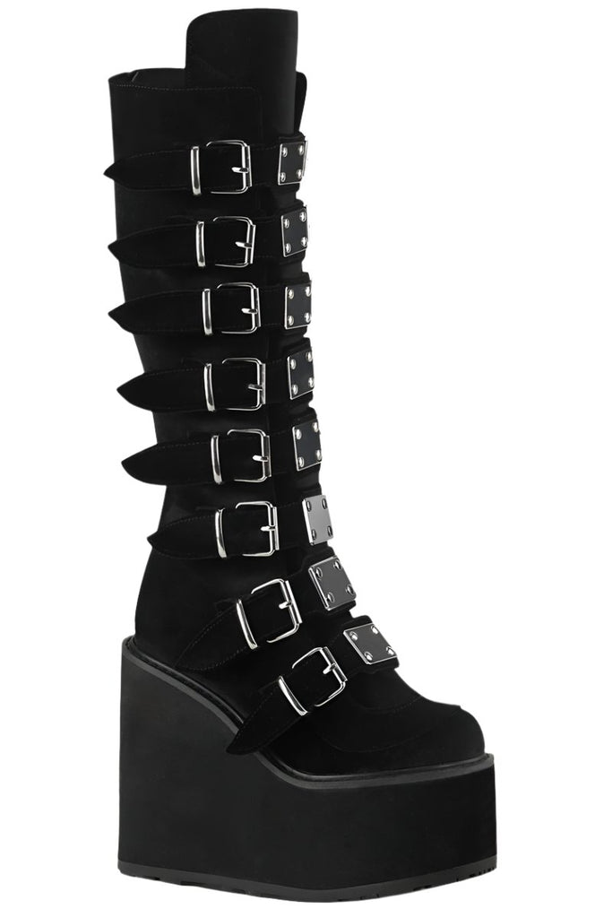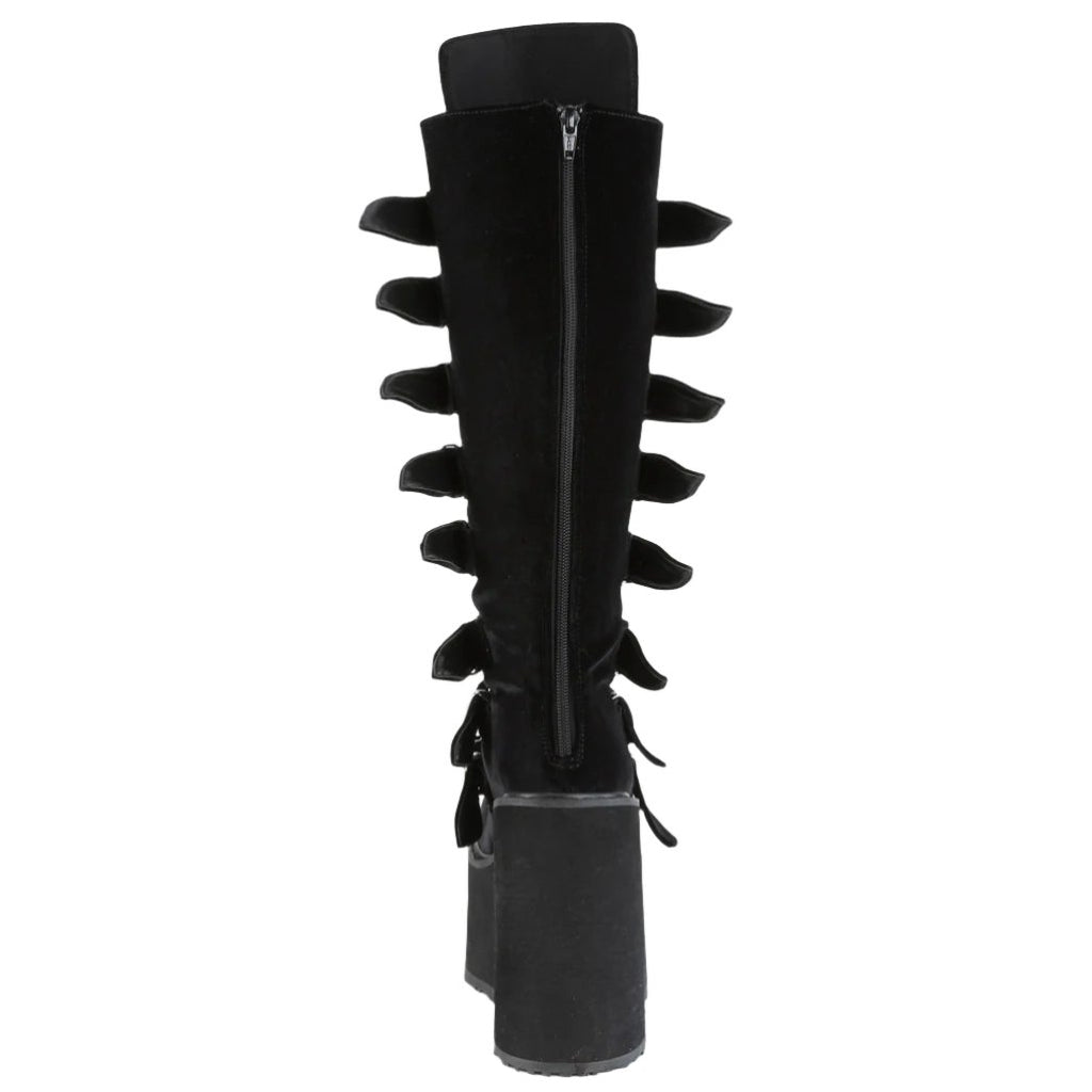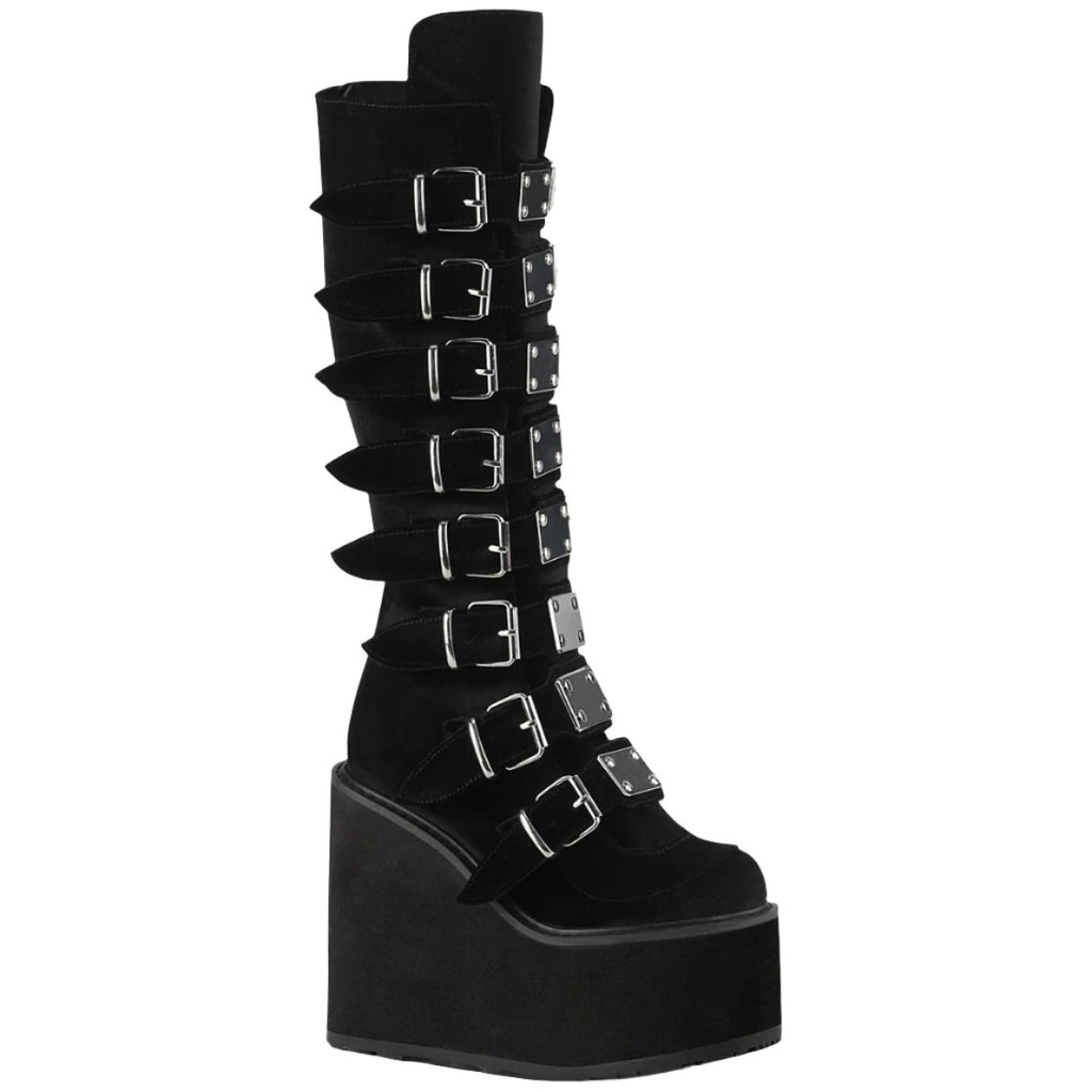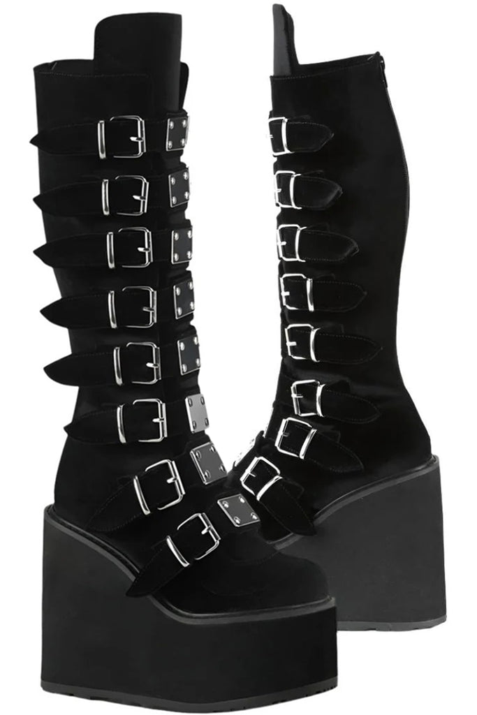 Keywords: DemoniaCult Swing-815 Boots, Black Boots, Velvet Boots, Platform Boots, Knee High Boots, Buckle Boots, Goth Boots, Punk Boots, Festival Boots, Alternative Fashion Boots, Comfortable Boots