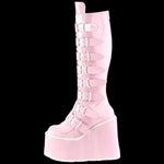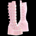 5 1/2" (140mm) Platform Knee High Boot Featuring 8 Buckle Straps with Metal Plates at Center, Back Metal Zip Closure.