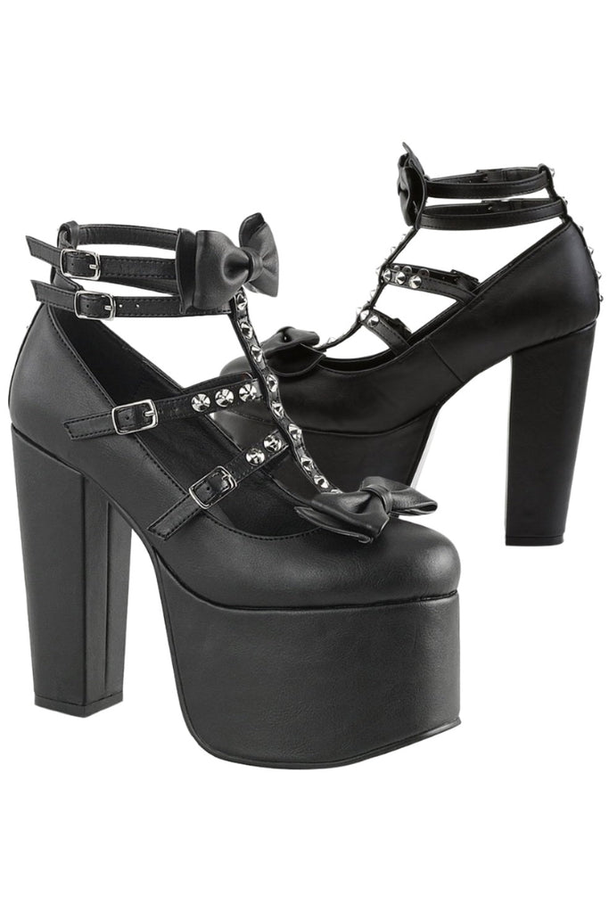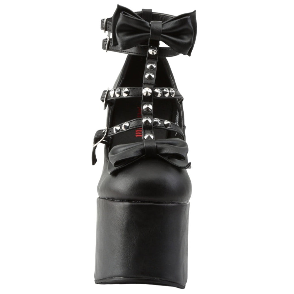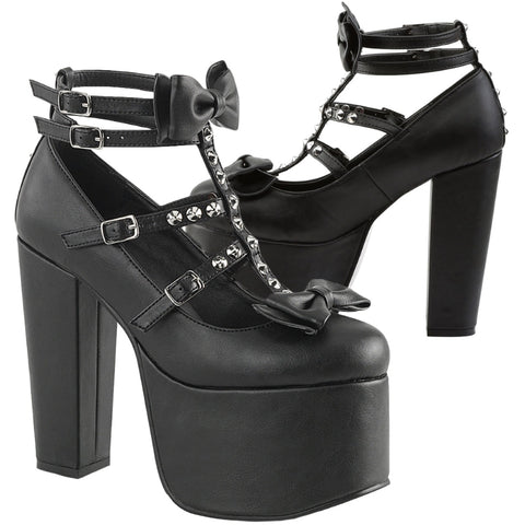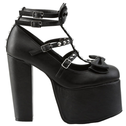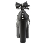 5 1/2" (14cm) Block Heel, 3" (7.6cm) Platform Strappy T-Strap Pump Featuring Double Bows and Spiky Studs Embellishment.