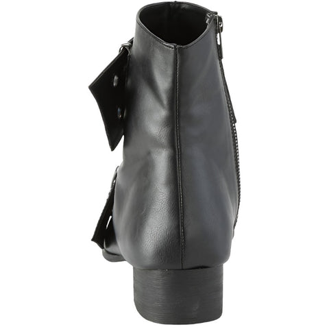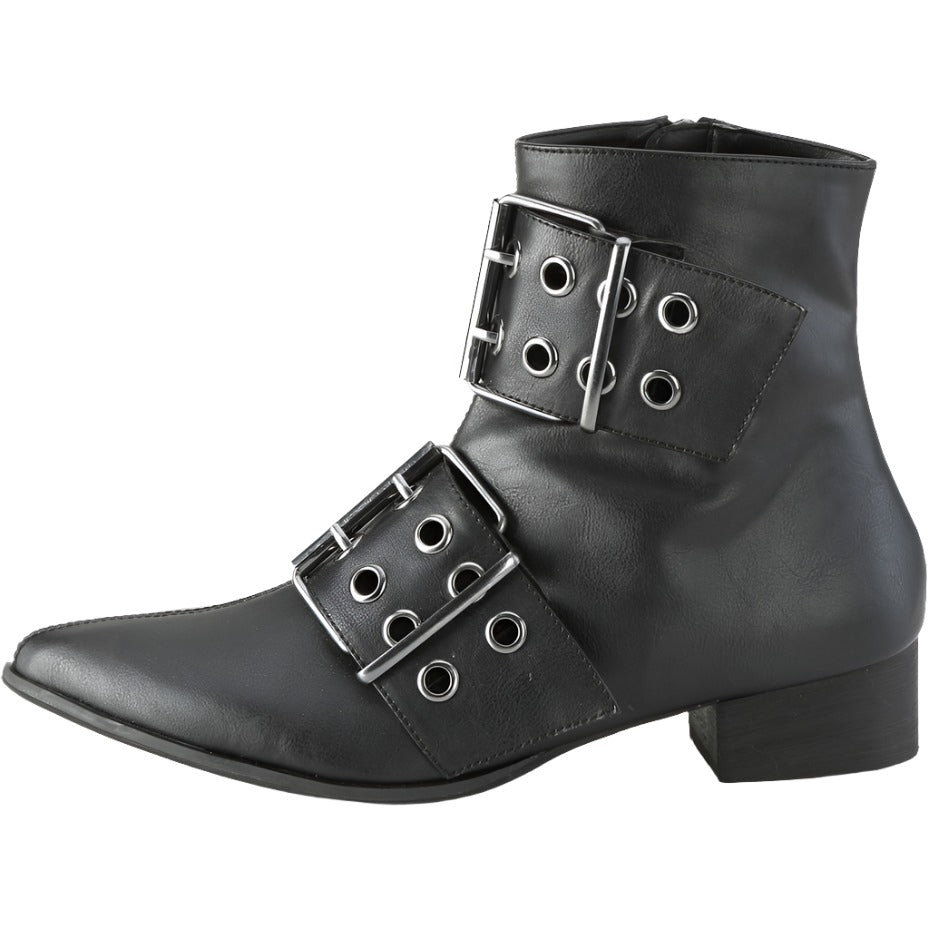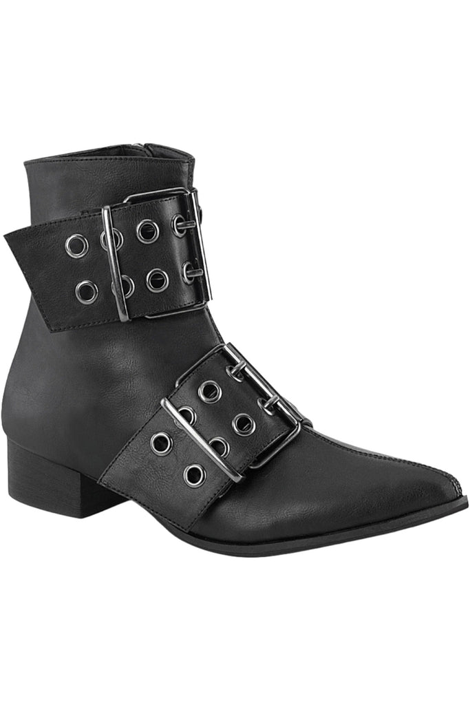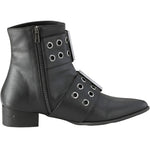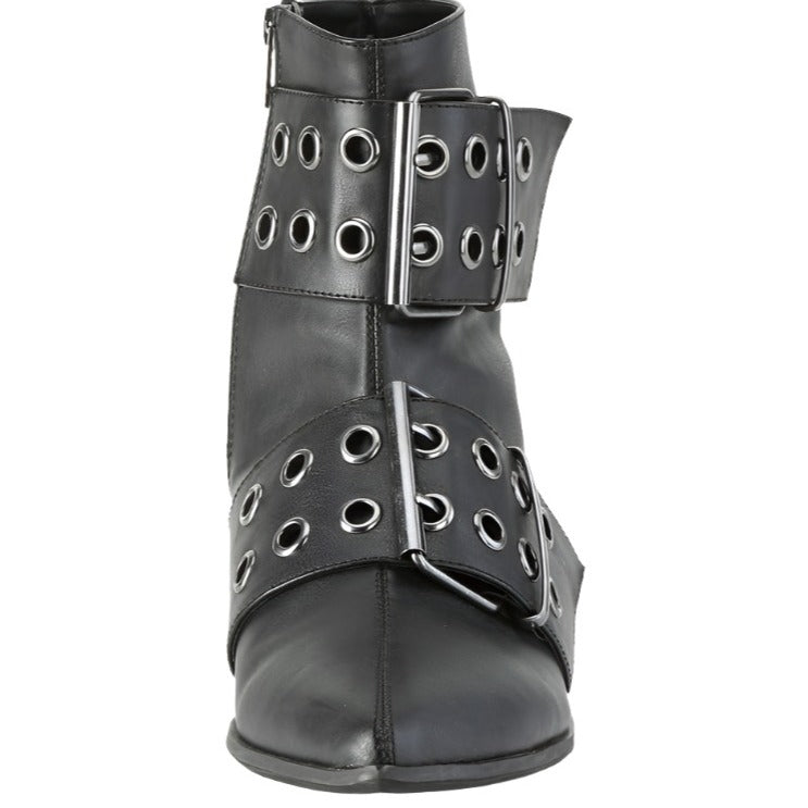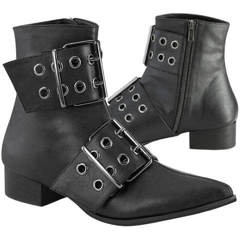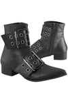 1 1/2" (38mm) Block Heel Pointed Toe Winklepicker Style Ankle Boot Featuring Double Grommet Buckle Straps, Inside Zip Closure.
