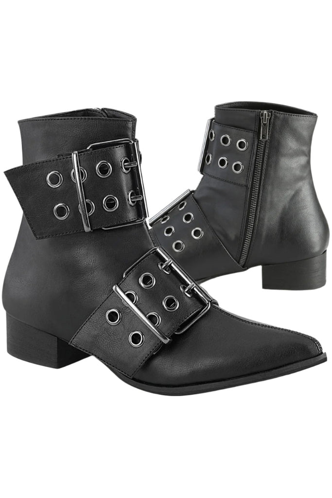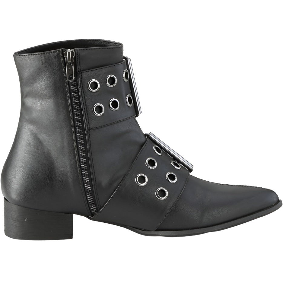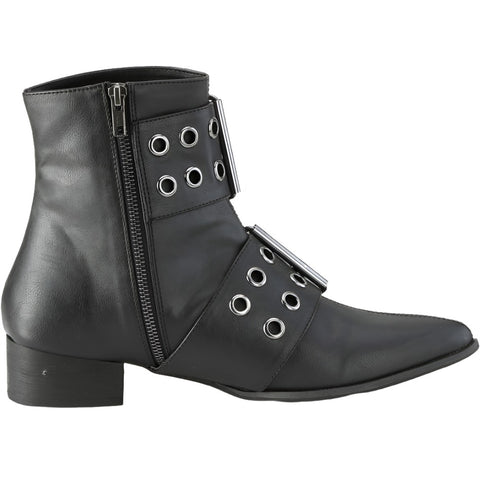 Command attention with a cruelty-free touch in the DemoniaCult WARLOCK-55 Black Vegan Leather Boots! These statement ankle boots boast a classic silhouette with edgy details, perfect for the eco-conscious fashionista who wants to showcase their unique style and values.