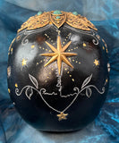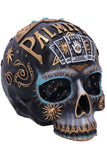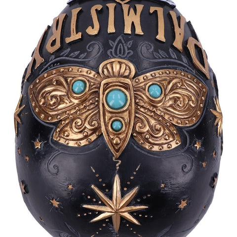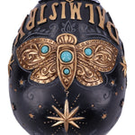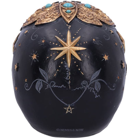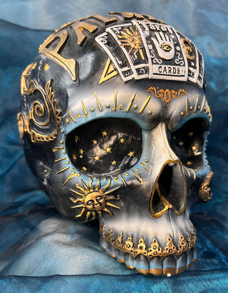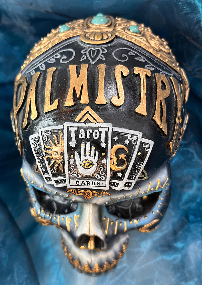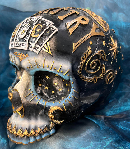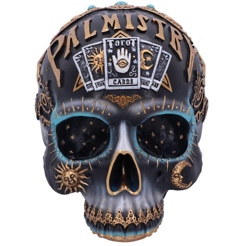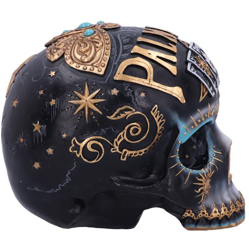 Painted in black paint and decorated with multiple Tarot cards on the upper cranium, with 'Palmistry' adorning the top of the skull. This piece also features various symbols and astrological signs, which decorate the sides of the skull in rich gold. Cast in the finest resin before being expertly hand-painted, this product is perfect for those who want to spice up their skull collection with something different.
