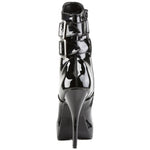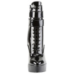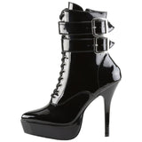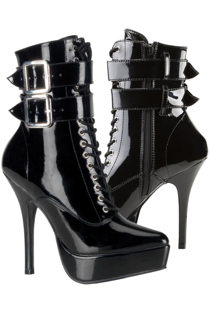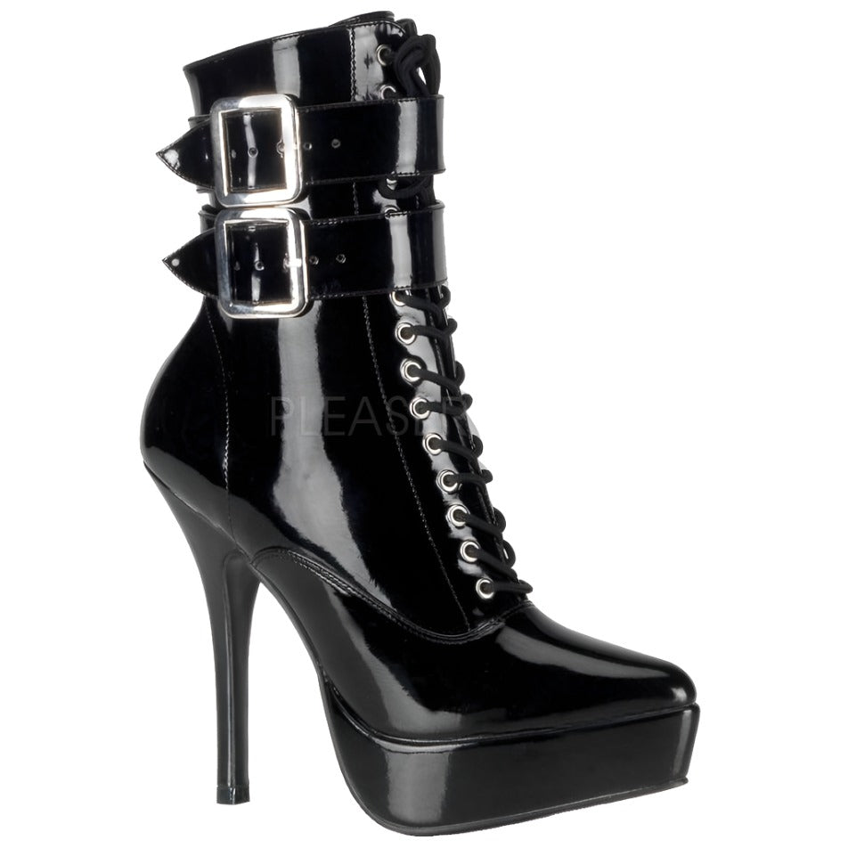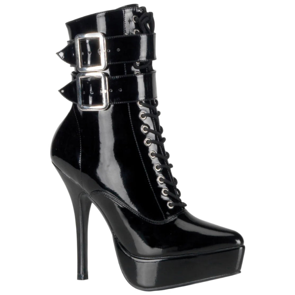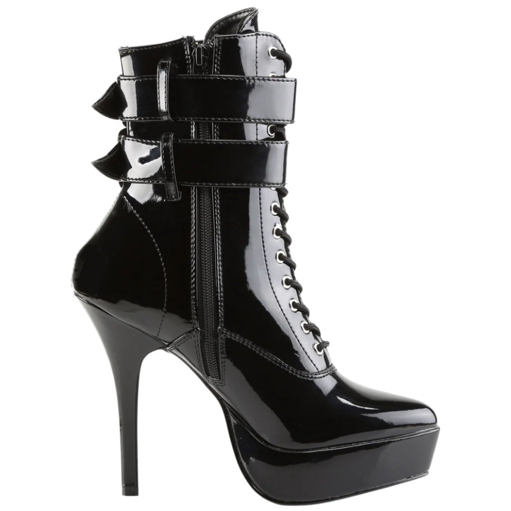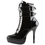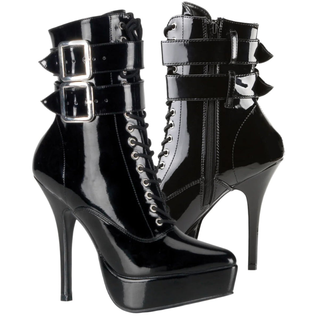 Devious Indulge 1026 Black Patent PVC Ankle Boots with twin buckle straps, front lacing, side zip, platform sole and stiletto heel.