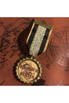 Hand crafted Steampunk medal with gold, black and and iridescent striped ribbon featuring Dinosaur Hunter motif.