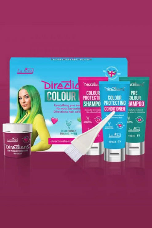 La Riche Directions Colour Kit is a beautiful and complete package. This package contains everything you need at your favourite Directions hair colour. La Riche Directions Colour Kit contains a semi-permanent colour 88ml, Pre Colour Shampoo 100ml Colour protecting shampoo 100ml Colour Protecting Conditioner 100m, a paint brush, gloves, a development cap and an instruction booklet.