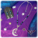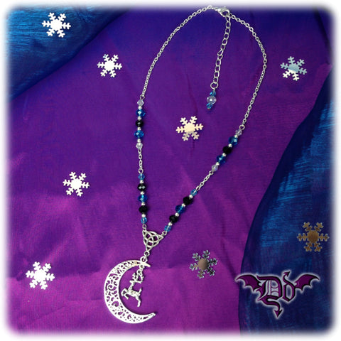 This eyecatching silvertone gothic necklace features a Reindeer jumping over a crescent moon! The necklace is adorned with winter night themed black and turquoise faceted glass crystal beads and silvertone spacers forming part of the chain, while a silvertone celtic knot connects the chain to a dazzling filigree style crescent moon charm dangling below it as the reindeer makes his way through. The necklace fastens with a silver-tone lobster clasp and is approximately 16 inches long (not including the moon charm), or would hang like an 18" necklace including the length of the charm. There is an extender chain with crystal bead drop so it can be worn a little longer if desired.