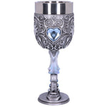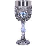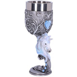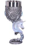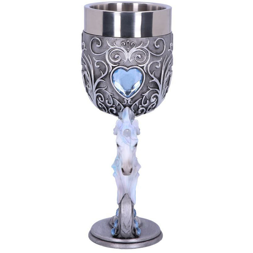 “When I look into your eyes, I see the promise of love” Adorned with intricate silver baroque detailing rising from the metallic base to the stainless-steel rim, this Goblet is the perfect addition to any fantasy collection. At the centre of the carefully sculpted stem is the head of a white Unicorn protruding outwards. Above it is an icy blue gemstone crafted into a traditional heart shape. Cast in high-quality resin and carefully hand-painted these Enchanted Hearts goblets can be paired together to form the shape of a heart, perfect for sharing with your mystic love.