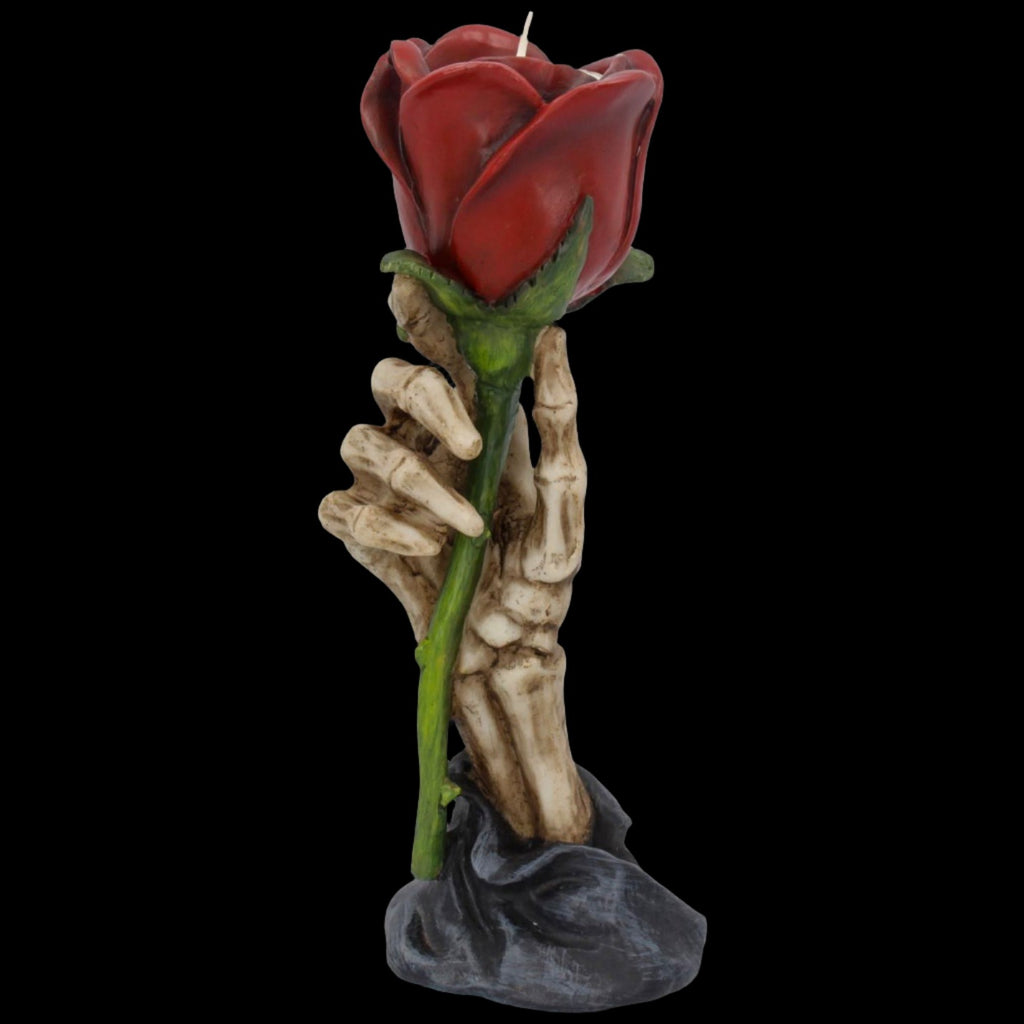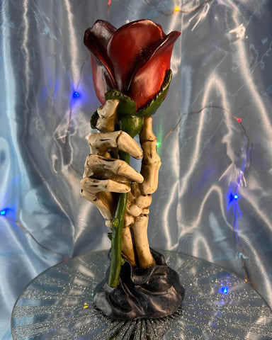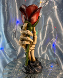 This piece shows that romance never dies. A skeleton hand rises up holding a delicate red Rose, which has been fashioned into a tealight holder. Cast in the finest resin before being expertly hand-painted, this piece would be at home as part of a Valentine's display or as a decoration on your alternative Wedding day.