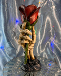 Add a touch of darkly romantic charm to your home with the Eternal Flame Candle Stick. This captivating piece features a skeletal hand reaching skyward, cradling a delicate red rose transformed into a tealight holder.