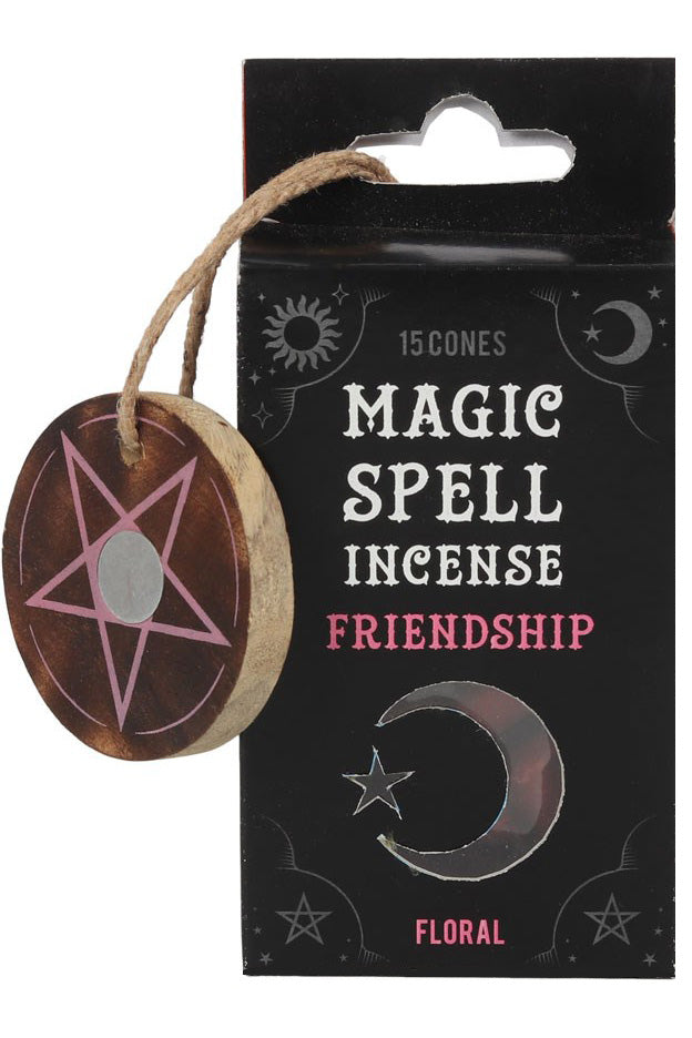 This box of magic spell incense includes 15 floral scented incense cones and a matching wooden pentagram holder that is perfect for accompanying spells of friendship and understanding. Whether used for spellwork or everyday enjoyment, this fragrance will attract all things kind and nurturing. Please practice caution when burning and never leave lit incense unattended.