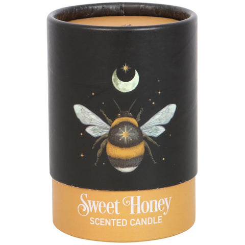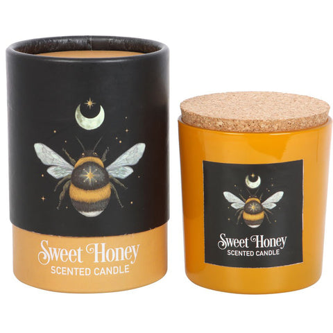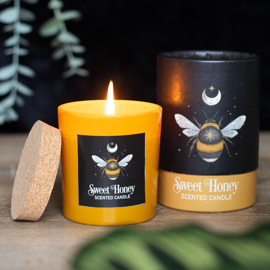 A Sweet Honey fragranced candle decorated with a mystical forest bee design and perfect for creating a magickal ambience. Glass holder with cork lid and beautifully presented in matching cardboard tube packaging. Vegan paraffin wax. Approximately 25-hour burn time.