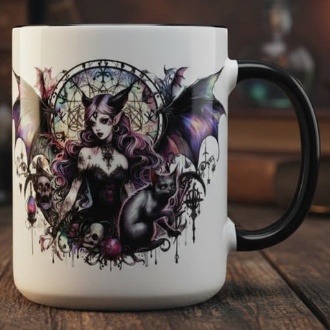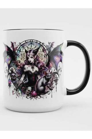 Crafted with meticulous attention to detail, the mug features a striking gothic fairy adorned with intricate tattoos and expansive, dark wings. Surrounded by mystic symbols and skulls, she exudes an air of enigmatic power. At her feet, a loyal black cat adds to the overall aura of mystique. The sleek black interior and handle provide a striking contrast to the fairy's ethereal yet sinister beauty, creating a harmonious balance of darkness and elegance.