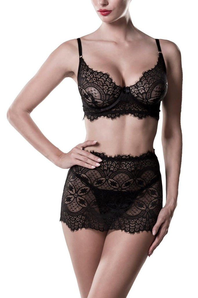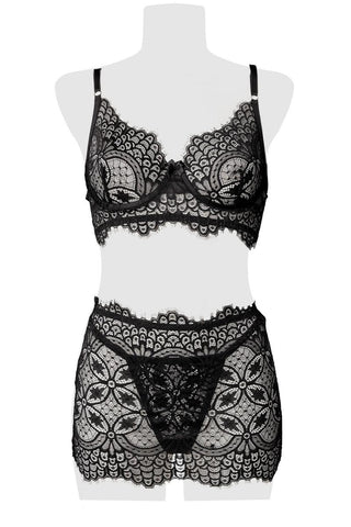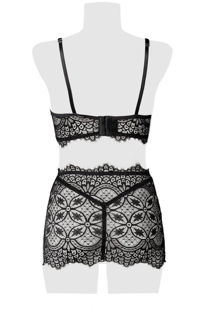 Adorned with a delicate floral pattern, this set is crafted from the finest, transparent lace, offering a captivating blend of elegance and sensuality. The bustier, featuring adjustable straps, provides a flattering silhouette, while the matching high-waist skirt adds a touch of vintage glamour.