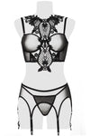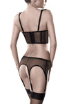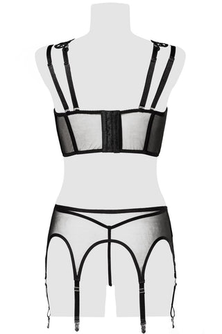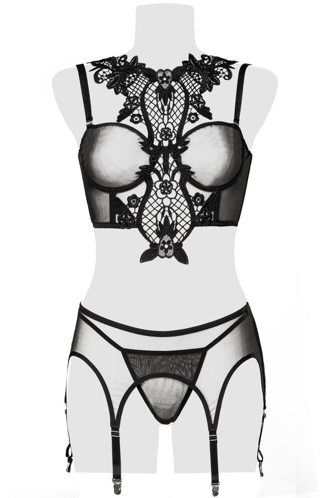 Crafted from sumptuous, transparent mesh and adorned with intricate crochet lace, this lingerie set exudes a captivating blend of sophistication and sensuality. The top offers a playful and alluring silhouette, while the thong and suspender belt complete the look with a touch of irresistible charm.