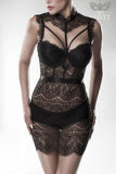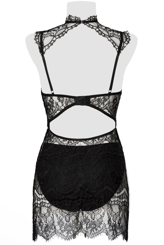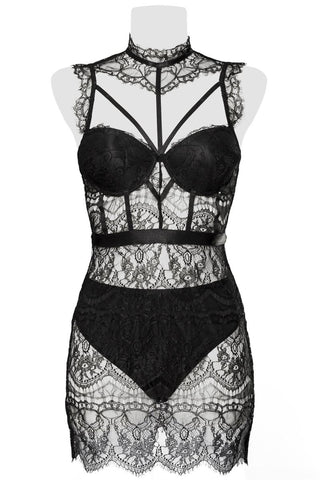 Crafted from transparent, elastic net lace adorned with a captivating floral pattern, this negligé exudes a sense of effortless glamour. The strategically placed cutouts add a touch of intrigue, while the underwired bra cups provide support and enhance your natural curves. The matching briefs complete the look with a touch of sophistication.