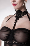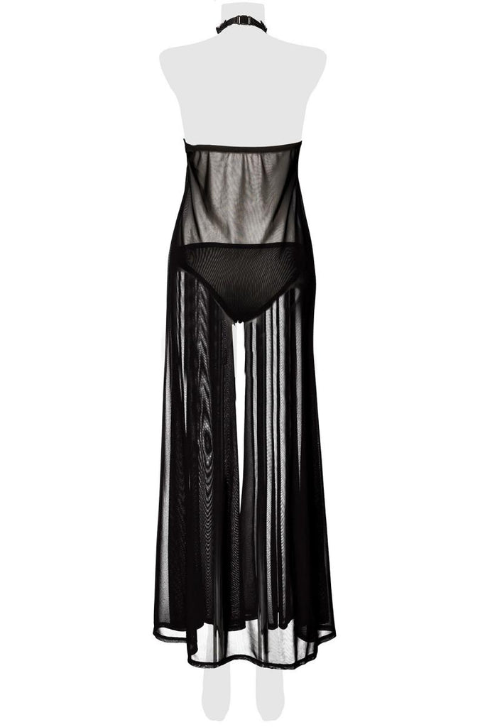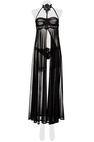 Crafted from a mesmerizing blend of transparent, elastic net, this maxi-length negligee exudes a sense of effortless glamour. Delicate crochet lace adorned with a floral pattern adds a touch of romantic allure, while underwire cups provide support and enhance your natural curves. The adjustable straps ensure a perfect fit, and the matching panties complete the look with a touch of sophistication.