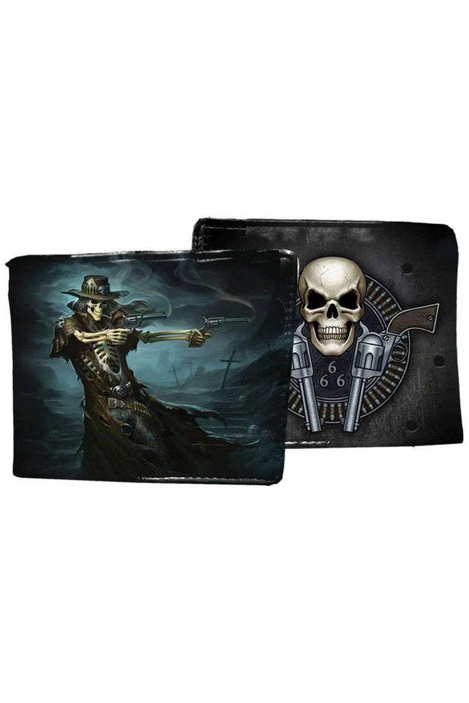 Hands where they can see ‘em, partner. From master of gothic fantasy James Ryman. In a mist-filled graveyard at night, crude wooden crosses marking where the bodies lie, this skeletal sharpshooter stands with pistols in outstretched hands, tattered rags hanging off their bones. Long grey hair blows in the wind from under their brown leather Stetson, and the smoke curling lazily from their cigarette matches the smoke rising from the barrels of the guns. On the back, there is a motif of a skull above the number 666, flanked by two six shooters and contained in a ring of bullets. Perfect for anyone who has a gun and needs to travel with their cash secure, this spacious and stylish wallet makes a fantastic gift.