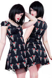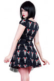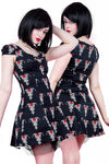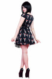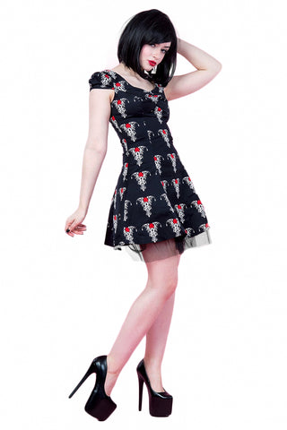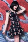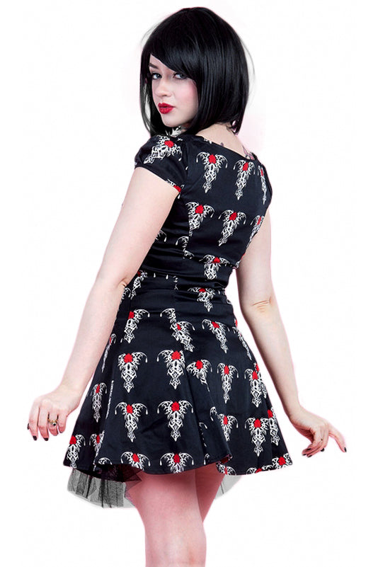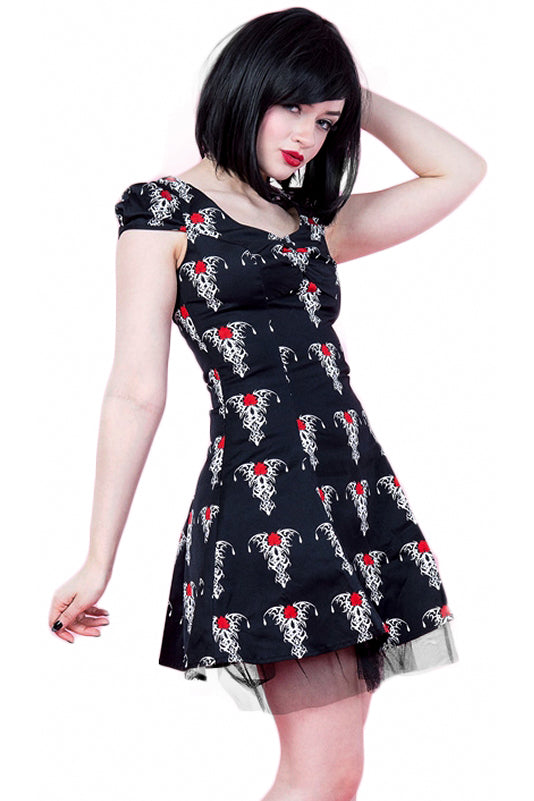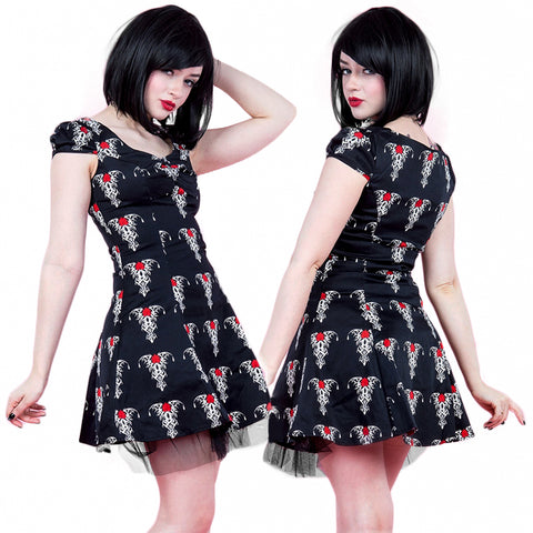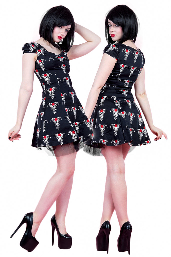 This super cute cotton minidress with red and white tribal rose tattoo design has short cap sleeves, gathering at the centre of the bust and a black net trimmed underlayer. The dress fastens with a hidden side zip. A great addition to your summer goth wardrobe!