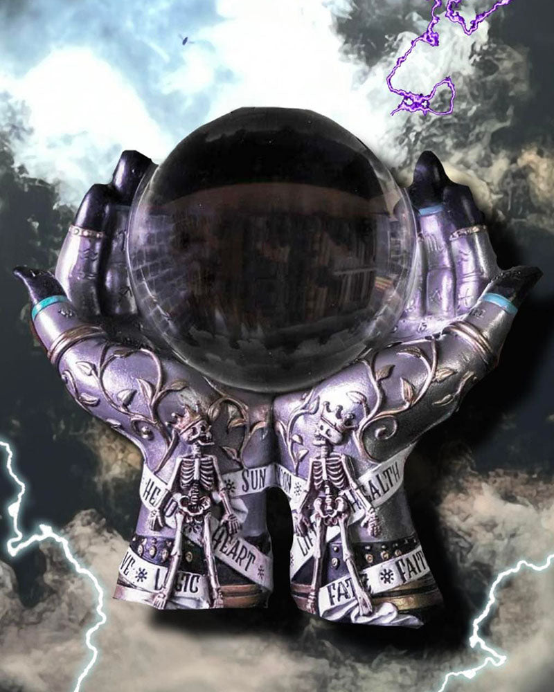 Ready to grasp onto your crystal ball, two silver hands can be seen. Decorated in traditional palmistry symbols. Two skeletons are located at the wrists of the hands, wearing golden crowns and standing in front of white ribbon which has been inscribed with the various words which correlate with the art of palm reading. Cast in the finest resin before being expertly hand-painted, this crystal ball holder is the perfect addition to any spiritual collection.