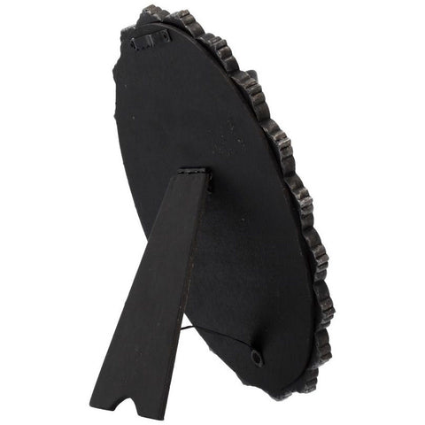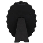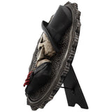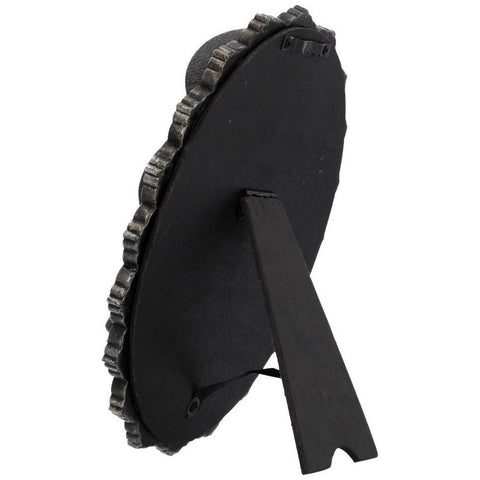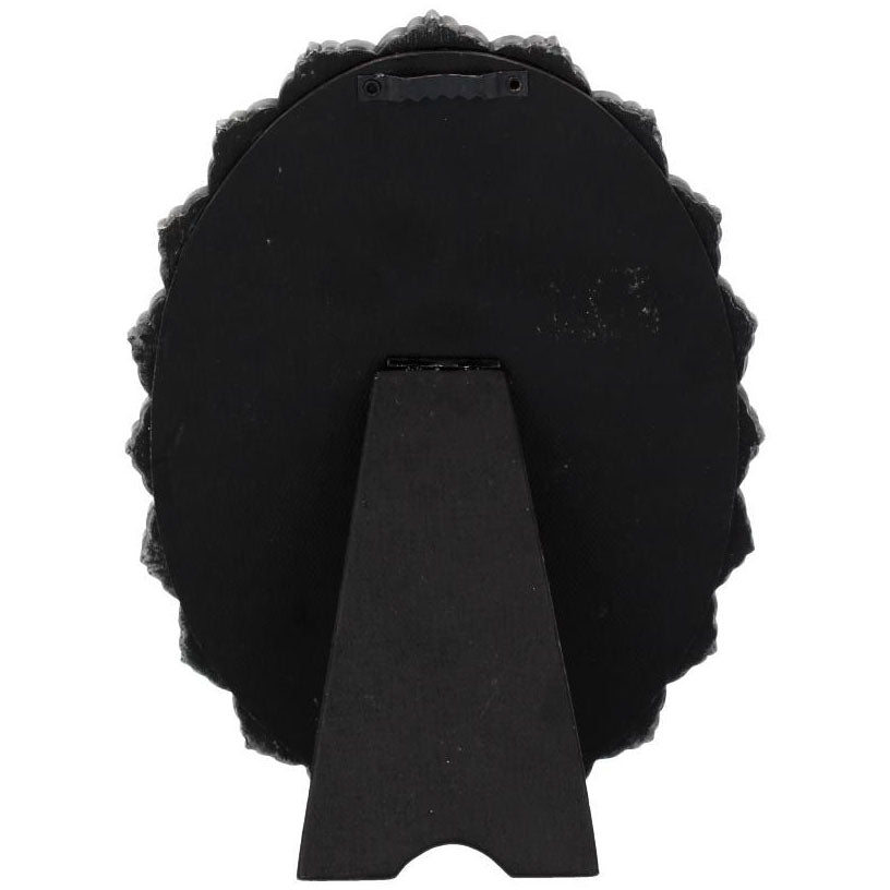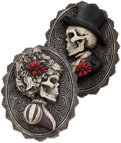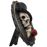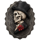 This handsome skeletal portrait comes from our own design team. Facing left, this skeleton wears a tuxedo with a black top hat. A red rose adorns his buttonhole in front of his white bow tie. Behind him, the oval plaque is covered in ornate patterns resembling thistles, with a scalloped border to the frame. Cast in high-quality resin before being expertly hand-painted, this dashing skeletal portrait can either be hung as a wall plaque or stand on its own.
