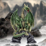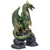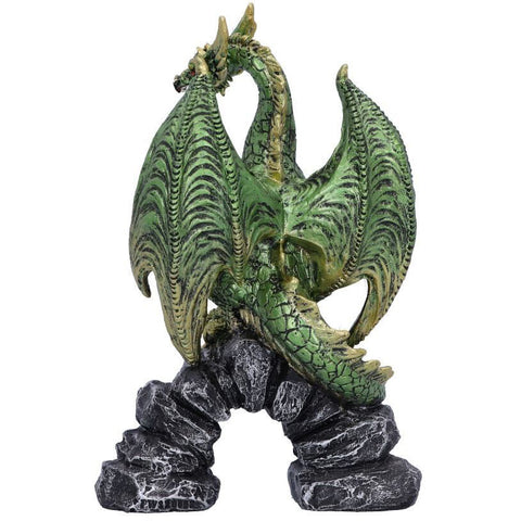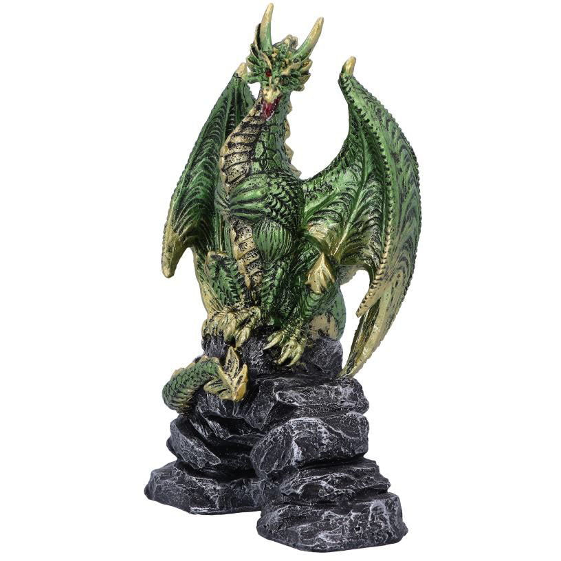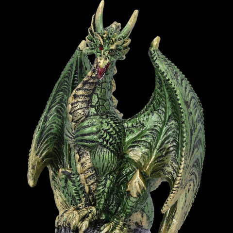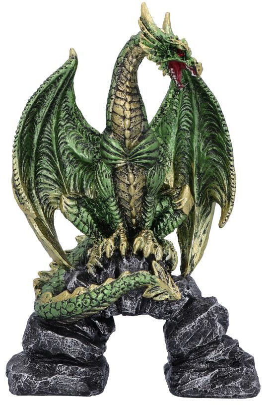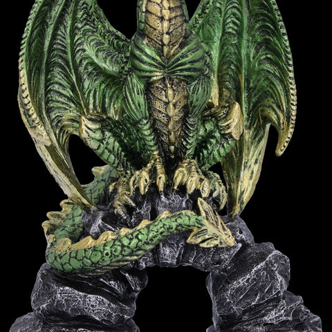 A metallic green dragon with gold accents on its claws, wings, and horns can be seen perched on top of an arch of rocks. With piercing red eyes and a menacing look, it prepares to let out its first fearsome roar to make itself known to all other creatures nearby. Cast in the finest resin before being carefully hand-painted.