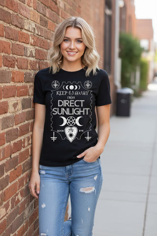 Crafted from premium 100% cotton, this t-shirt boasts a striking design that exudes an air of mystery. The bold "Keep away from Direct Sunlight" text is surrounded by intricate triple moon, planchette, and mystical symbols, creating a powerful and eye-catching statement.