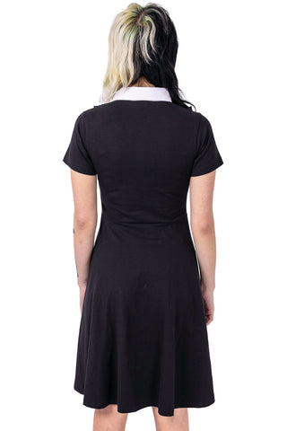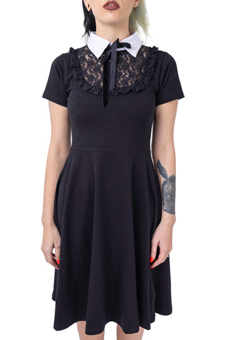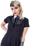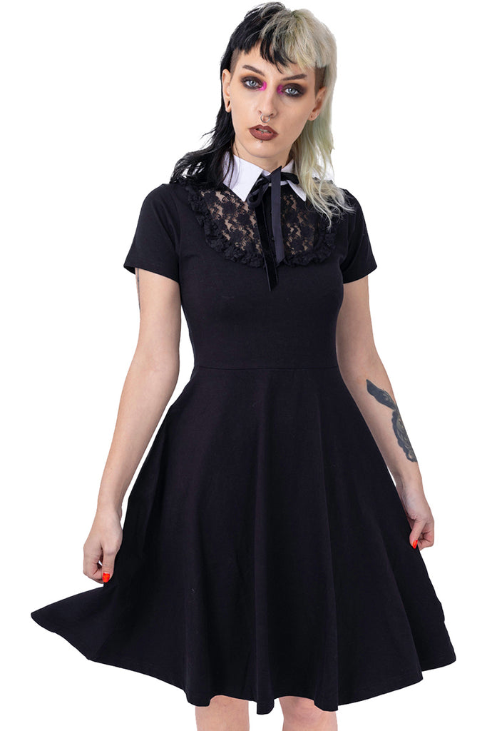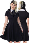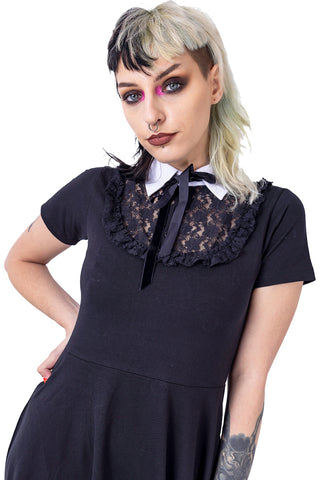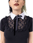 Designed for the Modern Gothic: The dress features a classic black hue, elevated by a striking white collar and intricate black lace panel that gracefully descends from the collar to the rounded neckline. A touch of luxury is added with a black velvet ribbon delicately placed at the center of the neck.