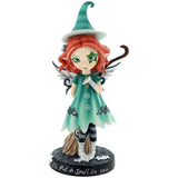 Cast in the finest resin before being expertly hand-painted. Wearing a turquoise dress and pointed hat, this unique fairy has a pair of delicate white wings emerging from her back.  Her light auburn hair frames her face which is decorated by a large star. In her hand, she holds a broomstick while spreading a little magic with the other. The theme behind the figurine is emblazoned on the black base, 'I'll Put A Spell On You'.