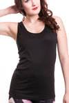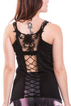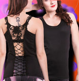 From the makers of Poizen Industries, this simple but pretty black vest top has a plain front but the back features a black lace applique across the upper back and shoulders moving down to delicate lattice style applique over a cutout section down the centre of the back mimicking the style of corset lacing edged with pretty black flowers.