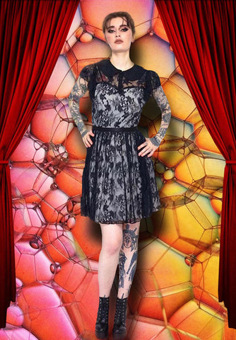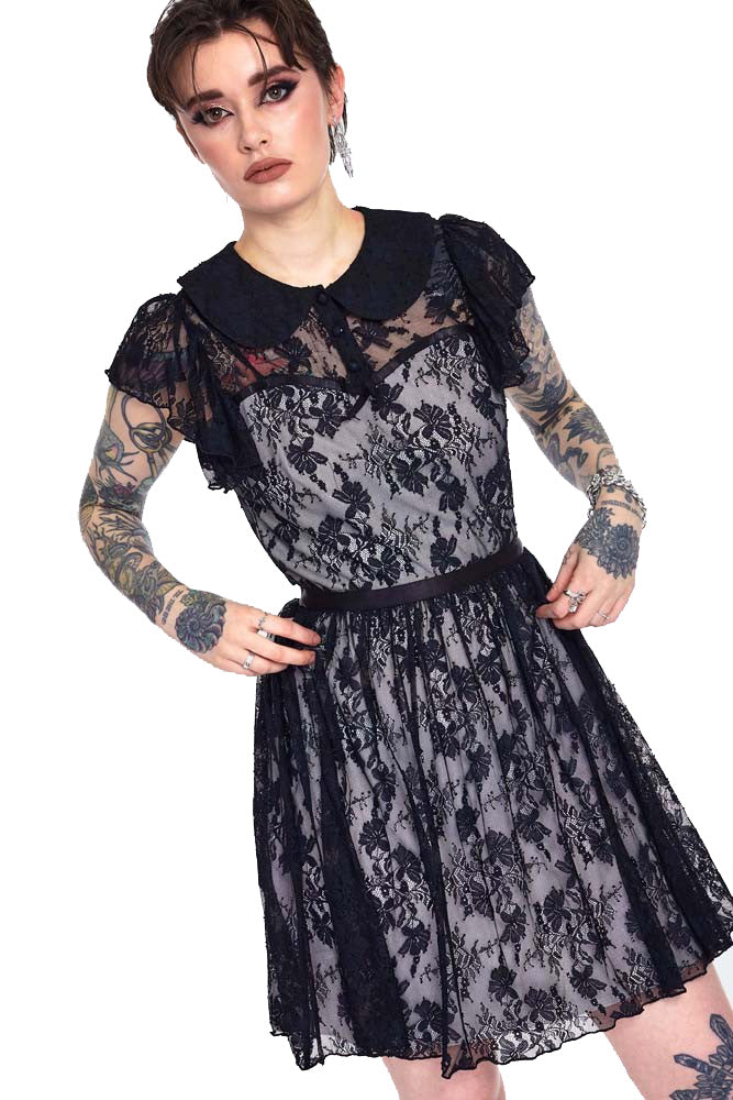 Express your unique style and embrace the darkness with a touch of sweetness. Order your Jawbreaker Lace Overlay Collar Dress today!