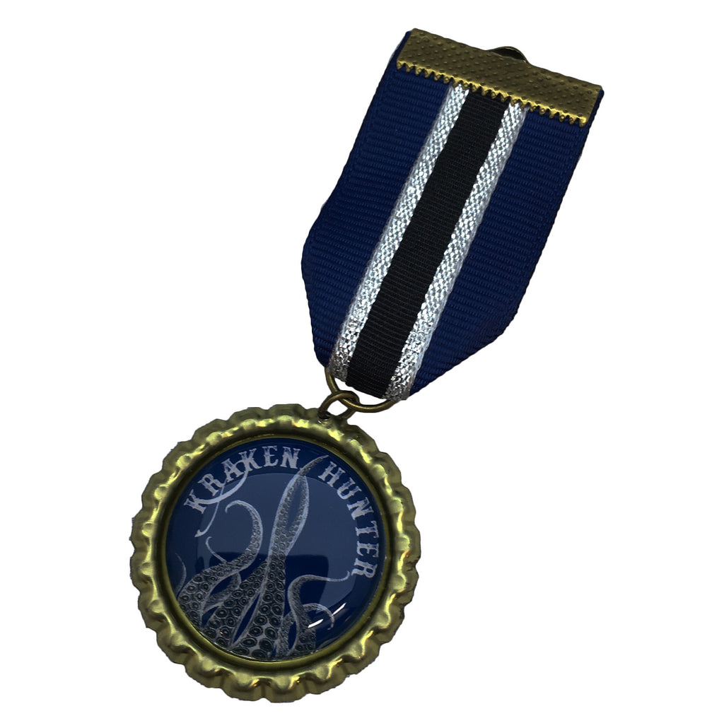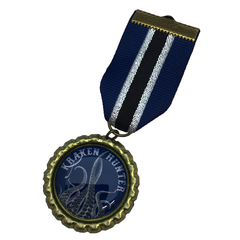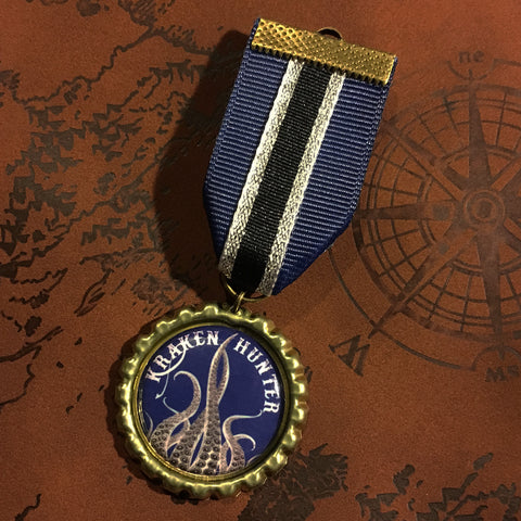 Hand crafted Steampunk medal with navy blue, silver and black striped ribbon featuring Kraken Hunter motif with tentacles design.
