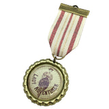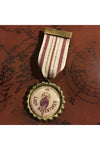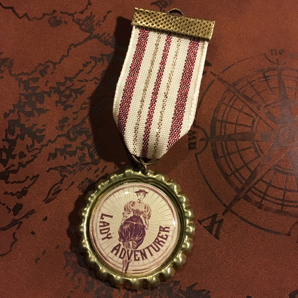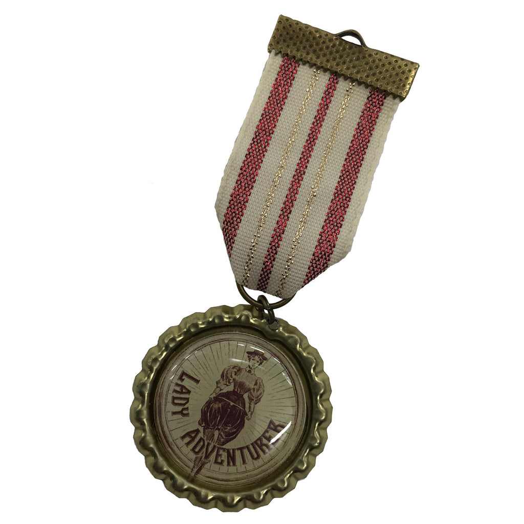 Hand crafted Steampunk medal with cream, gold and metallic red striped ribbon featuring Lady Adventurer motif.