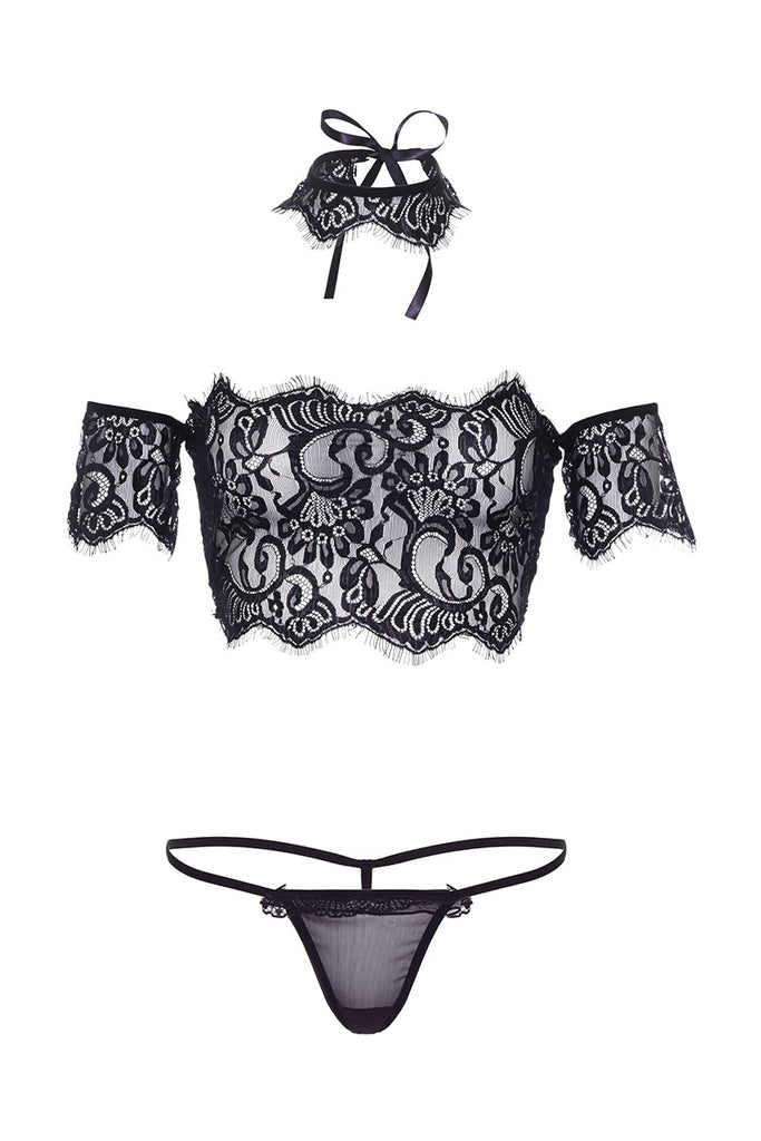 - Style: Lace, Strapless Crop Top with Cuff Sleeves, Choker, G-String