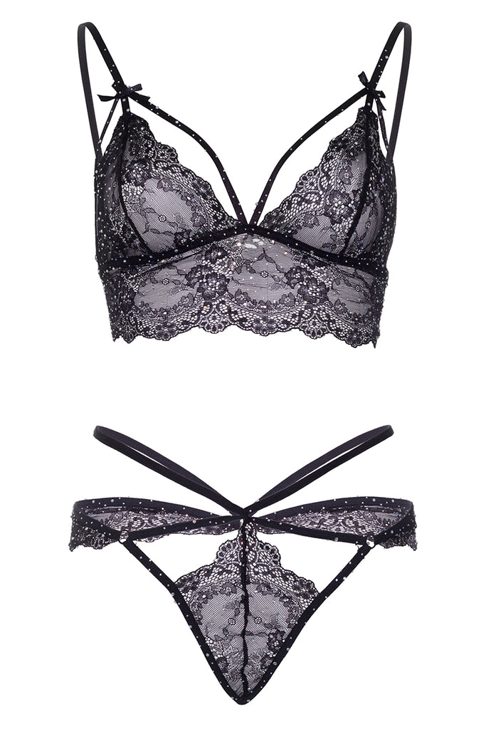 This set boasts a stunning scalloped lace bralette with adjustable straps for a perfect, comfortable fit. Delicate rhinestone embellishments add a touch of glamour, making this a lingerie set you won't want to hide. The matching g-string features a captivating cut-out strappy design, offering a balance between alluring sensuality and comfortable coverage.