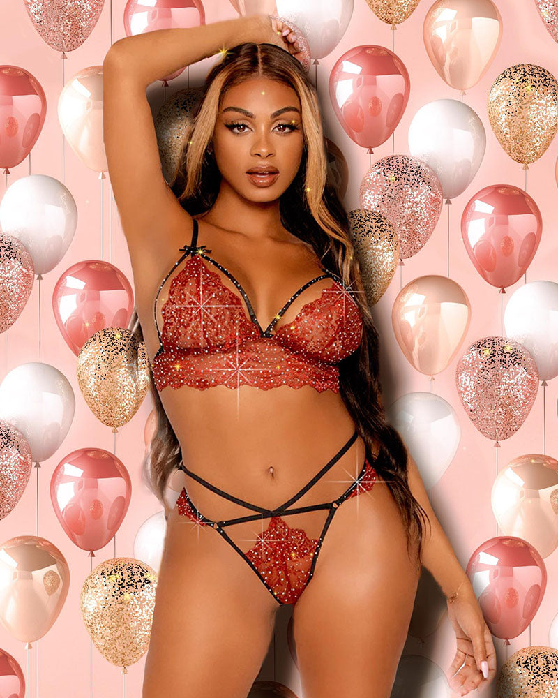 Calling all lingerie lovers with a taste for something bold and beautiful! The Leg Avenue Strappy Bralette and G-String Set (available in a captivating burgundy hue) is here to set your heart racing and your confidence soaring. This two-piece masterpiece combines luxurious lace, shimmering rhinestones, and a touch of playful strappy details, creating a look that's both undeniably sexy and effortlessly stylish.