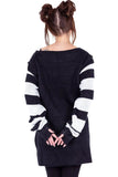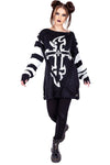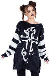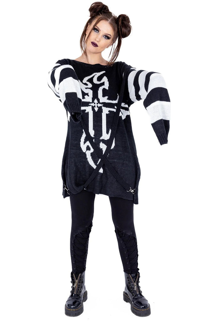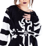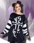 Designed for the Modern Gothic: The Lilith Jumper features a striking black and white color palette, with a bold gothic cross design taking center stage on the front. The black and white striped sleeves, complete with thumbholes, add a touch of rebellious charm. The detachable cross straps offer a customizable element, allowing you to create your own unique look.