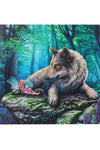- Enchanting Lisa Parker Artwork: The picture depicts a serene scene of a kind wolf attentively listening to a mischievous fairy reading from a glowing book.