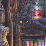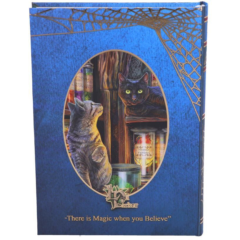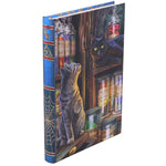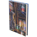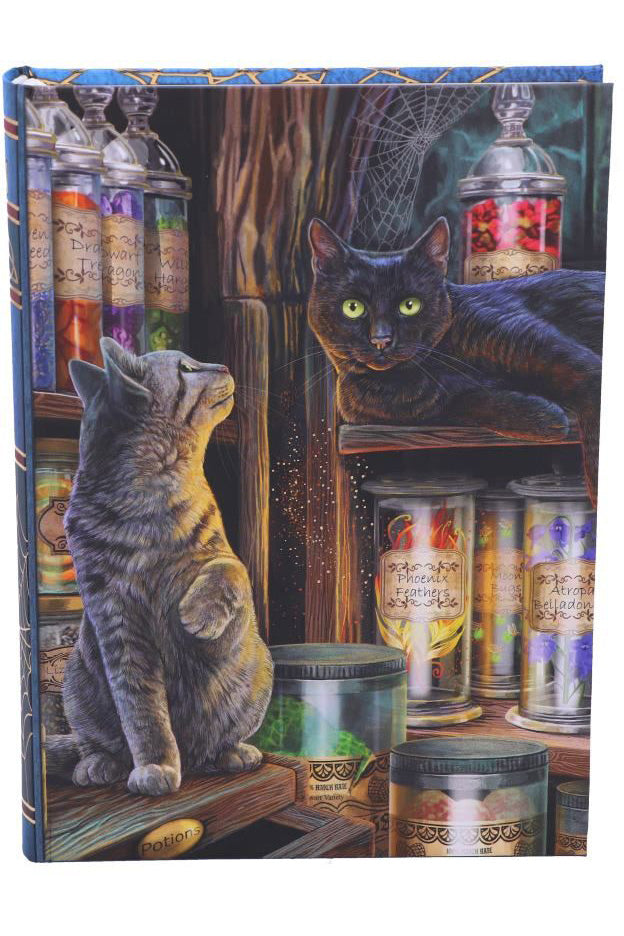 From the untamed imagination of Lisa Parker. Laid across a shelf of a magical potion store, a black feline stares straight ahead with its piercing green eyes. Whilst his companion sits on top of a cupboard next to him, scoping out all of the magical ingredients surrounding them. Made of high-quality paper, this portable journal is perfect for writing down your magical adventures.