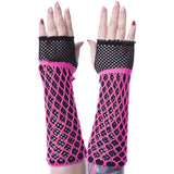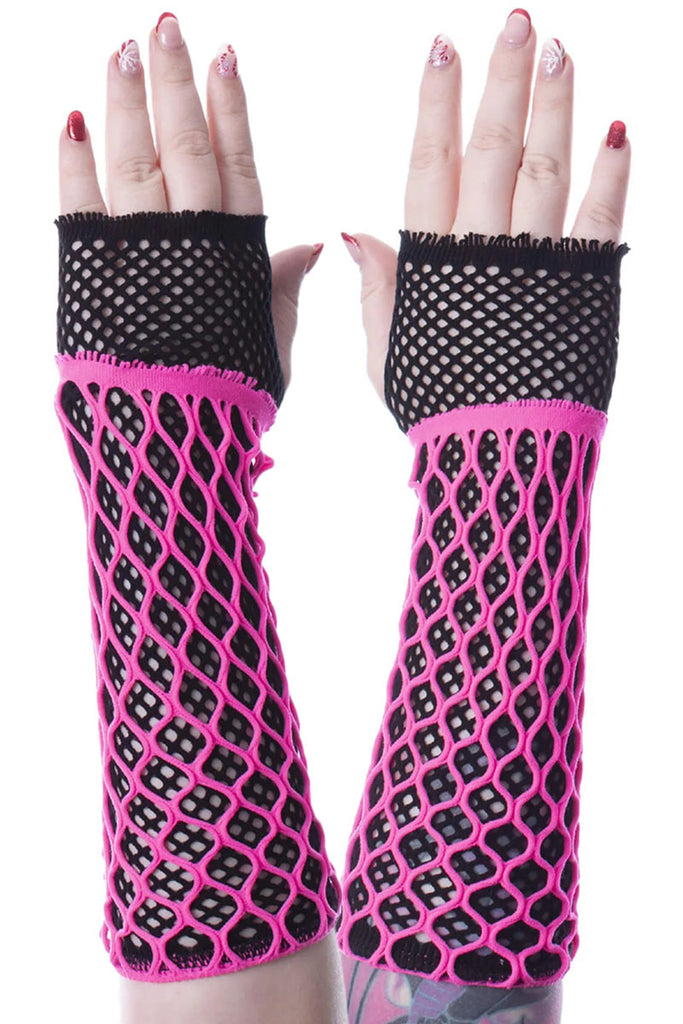 Poizen Industries double layer Hot Pink Fencenet and Black Fishnet mesh gloves / Armwarmers with thumbhole.