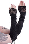 Poizen Industries long black satin gloves / Armwarmers with lace panel over the hand and around the top by the elbow. The gloves have one hole for the fingers and one for the thumb. Down the back of the satin section of the glove is black corset style ribbon lacing and black lace ruffle trim for an elegant effect. One size.